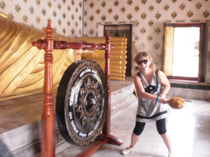Nos agenciamos un mapa y nos vamos al primer templo llamado Wat Senatsanaran Rachaworcwiham. Allí vemos un buda tumbado y nos dedicamos a tocar un gong que hay cercano.