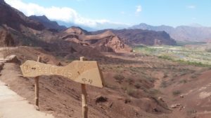 Mi amiga Ana se ha pasado la noche temblando de frío y hacía un calor terrible. Finalmente decide no venir porque ha debido coger algún virus y está fatal la pobre.. Pedimos nos devuelvan el dinero pero nos dice que ya han reservado asiento y que no es posible. Detrás mío se sientan una pareja de gaditanos muy salados. Son Antonio y Maria Carmen, pareja que celebra las bodas de plata y han decidido pegarse este homenaje. La guía se llama Corina y el conductor Marcelo. La guía es muy charlatana y nos dará muestras todo el camino. Iremos por la ruta 68 y pasaremos por distintos pueblos. Nos da los buenos días y rápido se pone a resumir la excursión. Nos habla que mucha gente se dedica a la industria del tabaco Virginia ( tabaco rubio). Nos habla del dique Cabra Corral ( oficialmente embalse de Belgrano) que protege a la ciudad de aludes de barro en épocas lluviosas. Dice que veremos una viña y haremos una cata, pararemos en el entorno de la quebrada de Las Conchas para ver las formaciones, pararemos en el kilómetro sexual, en las tres cruces a 1700 metros para ver la Quebrada, en las geoformas, anfiteatro, garganta del diablo, atravesamos el valle Cachalquies y veremos la plaza del 20 de Febrero, el museo y la Iglesia de Cafayate. Pararemos en los castillos y la yesera.