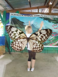 Tras salir el conductor recibe una llamada y nos dice tiene que volver porque se ha confundido de huéspedes. Casualidad había otra pareja que también tenía contratado esto mismo en nuestro alojamiento. Retrocedemos y el jefe viene en su coche con la pareja correcta. Vamos a la agencia y explico lo que nos ha pasado. Nos van a llevar en coche particular por las molestias causadas. Viene un chico llamado Rapra de 20 años. Dice no tiene familia ( imaginamos que por el tifón) y que se gana la vida trabajando de sol a sol. Sólo libra en año nuevo. Dice tiene una novia. Lleva dos años en el oficio y dice que gana 250 php al día. Hoy le daremos esto mismo de propina porque nos ha caído bien. Nos llevará ahora a Butterfly Garden donde veremos por 45 php cada uno varias mariposas. Una chica me pide el móvil y me hace fotos originales.