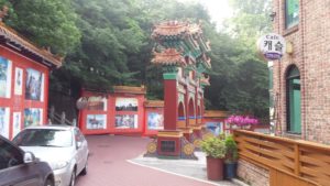 Subimos una cuesta que nos llevará a una serie de paneles pintados de Confucio. Pasearemos la zona viendo dragones, farolillos, puertas rojas y diversos adornos chinos que llaman la atención. Hasta las alcantarillas tienen formas especiales.